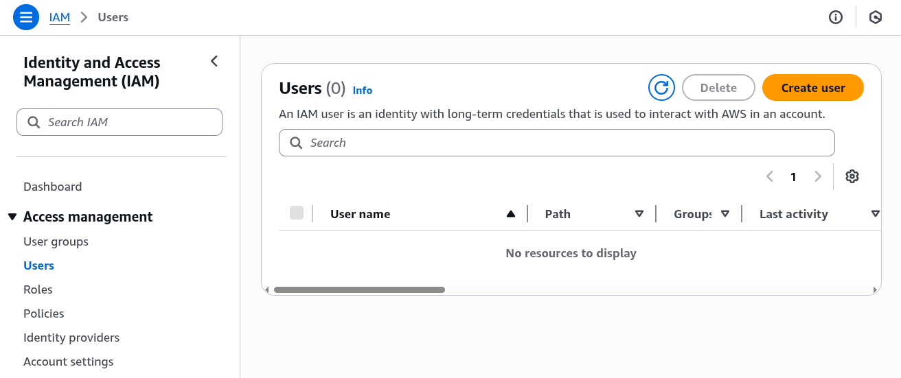 To set up an IAM user, visit Identity and Access Management (IAM). Once there, click on "Users" under the "Access management" list located in the left-hand menu. This should bring you to the page shown in the screenshot below. Click the orange "Create user" button on the right-hand side of the page to start creating an IAM user.