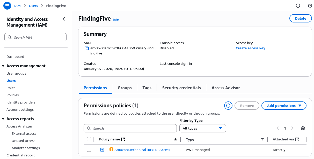 The next step should just display a summary of the new IAM user to be created. Importantly, please make sure that the "Permissions summary" panel includes the MTurk full access permission we chose in the previous step. If everything looks good, click "Create User". You should be brought back to the Users page we were on just before, and your new "FindingFive" user should be listed there.