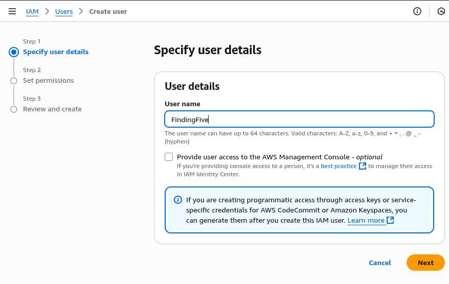 First, you must name the IAM user. We recommend using just "FindingFive", since we will be the authorized user and this will make it easy to identify. The "Provide user access to the AWS Management Console" option should be unchecked by default—leave it unchecked. Click "Next" when you are ready.