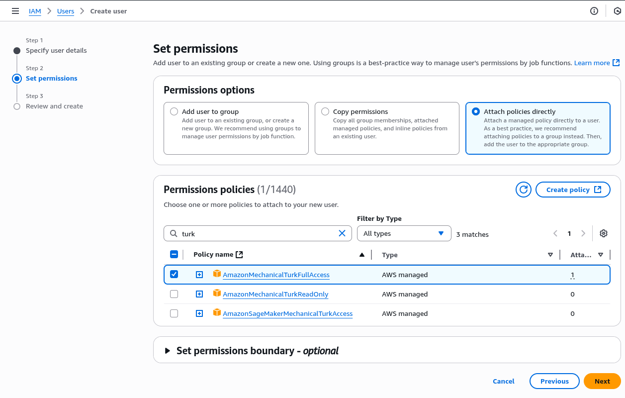 The next thing to configure is permissions for this IAM user. We'll choose "Attach policies directly", and then in the policies shown below, search for "turk". There should be three related policies as shown in the screenshot below. We just need to check the "AmazonMechanicalTurkFullAccess" permission. Click "Next" when you are ready.