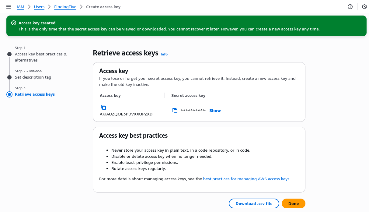 AWS will ask you for the "use case" and attempt to advise you on best practices. For integration with FindingFive, you can either choose "third-party services" and get an earful or just "others" for simplicity. In either case, this is just an informational step and does not have an effect on creating the keys. Click "Next" to enter optional tags (you don't have to add any) and "Next" again to see the keys.
