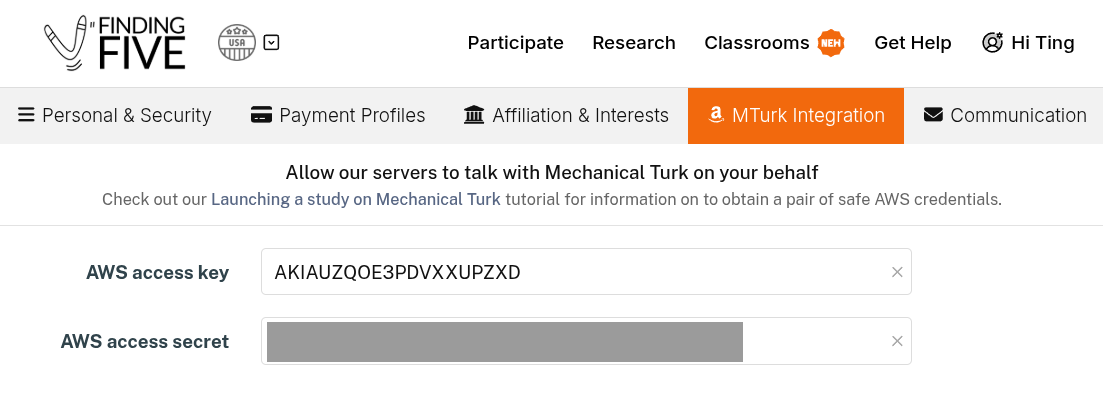 Okay, it's finally time for the first (and only) part of this process that takes place on FindingFive! Now that you have an IAM user authorized to access MTurk features for your AWS account, you'll need to tell FindingFive the access keys so that we can act as this IAM user.