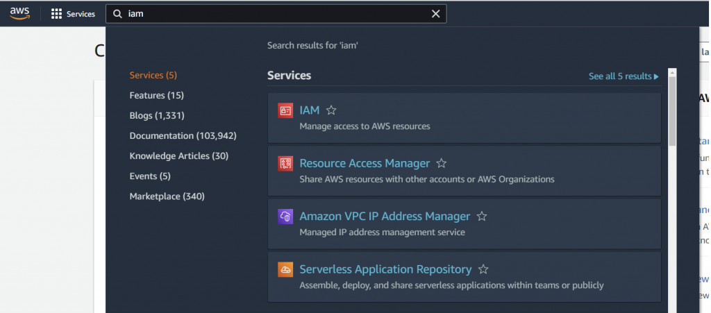 When logged into your AWS account, you should see a search bar at the top of the screen. Type "IAM" into the search bar and choose "IAM" from the search results (it should be the first option).