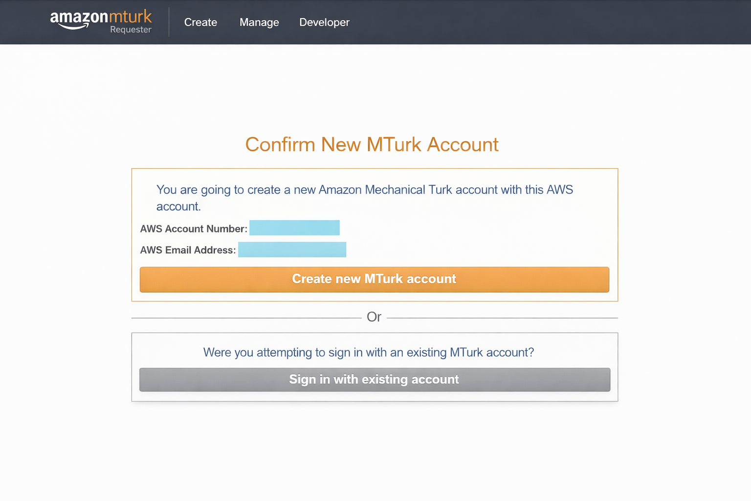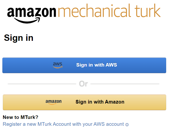 Use the "Sign in with AWS" option to sign in using the AWS account you just created. Once you sign in, MTurk may ask if you already have an account with MTurk. We advise you not to use a pre-existing MTurk account here as the process is unreliable and may result in you getting locked out. Instead, confirm the creation of a new MTurk account using your AWS account information.